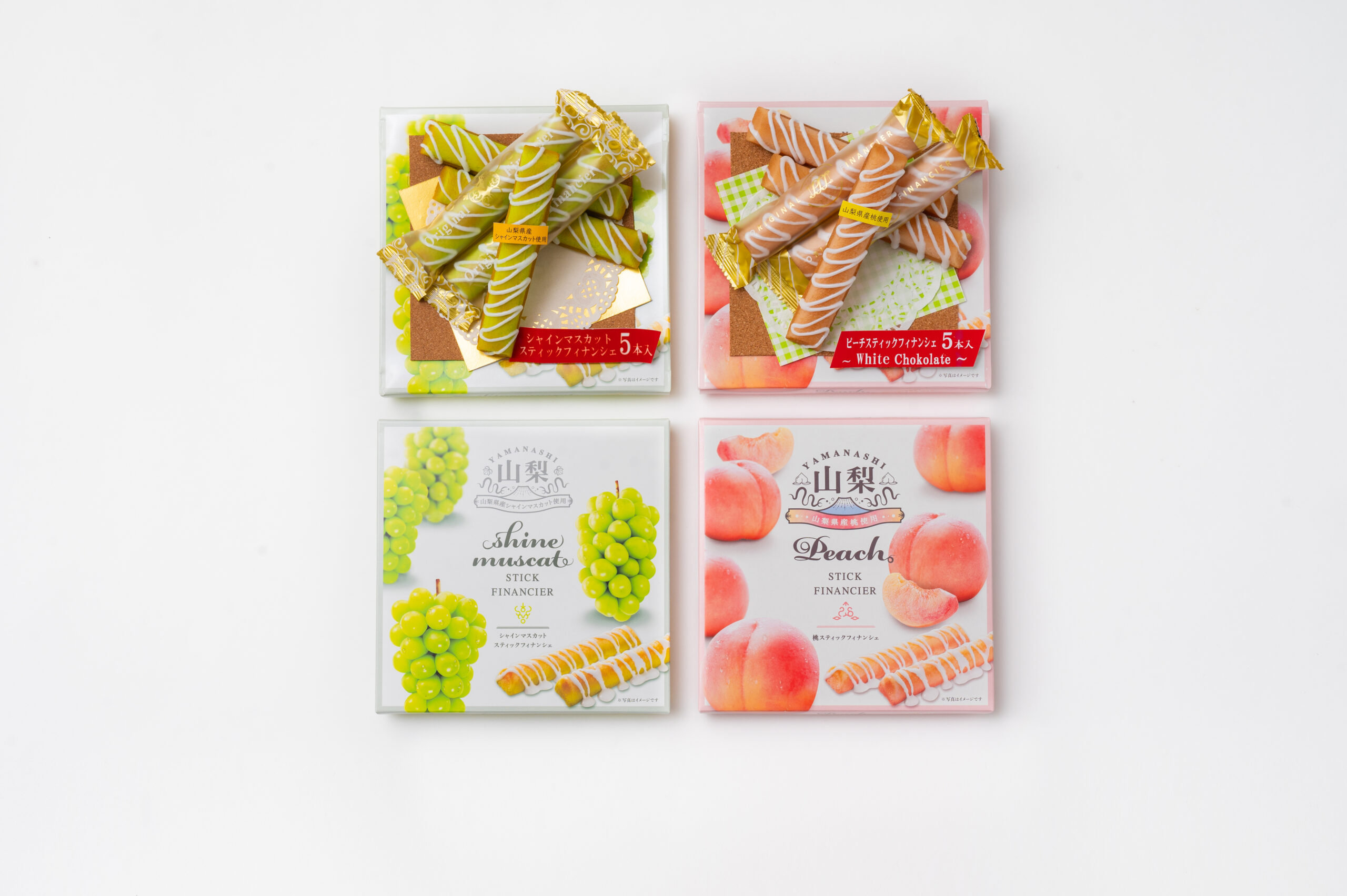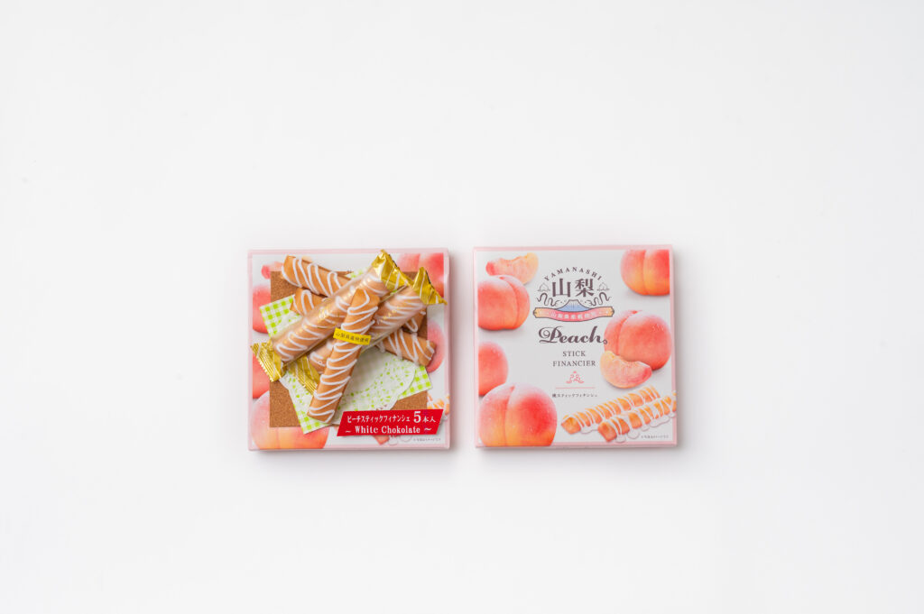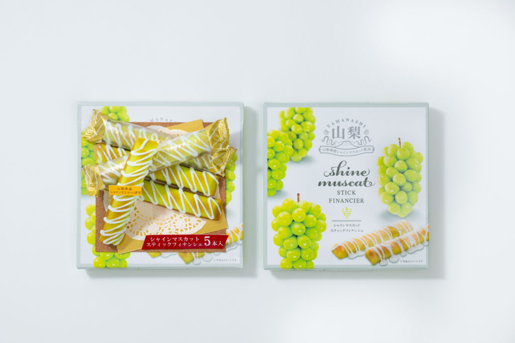 本来、焦がしバターやアーモンドの香りが特徴の焼き菓子フィナンシェを、山梨らしくシャインマスカットと白桃の香りで包みました。形も食べやすいスティック状にし、仕上げに職人の手によりホワイトチョコをかけています。パッケージデザインシンプルかつエレガントなものにし、光沢のある化粧箱でオシャレ感を演出しています。本商品は山梨土産としてはもちろんのこと、プチ贅沢なおやつや、普段のティータイムのお菓子として利用したり、デスクの上のペンケース差しておいたり、バックの中に忍ばせるなど、気持ちを上げたいときに気軽に食べてほしい商品です。