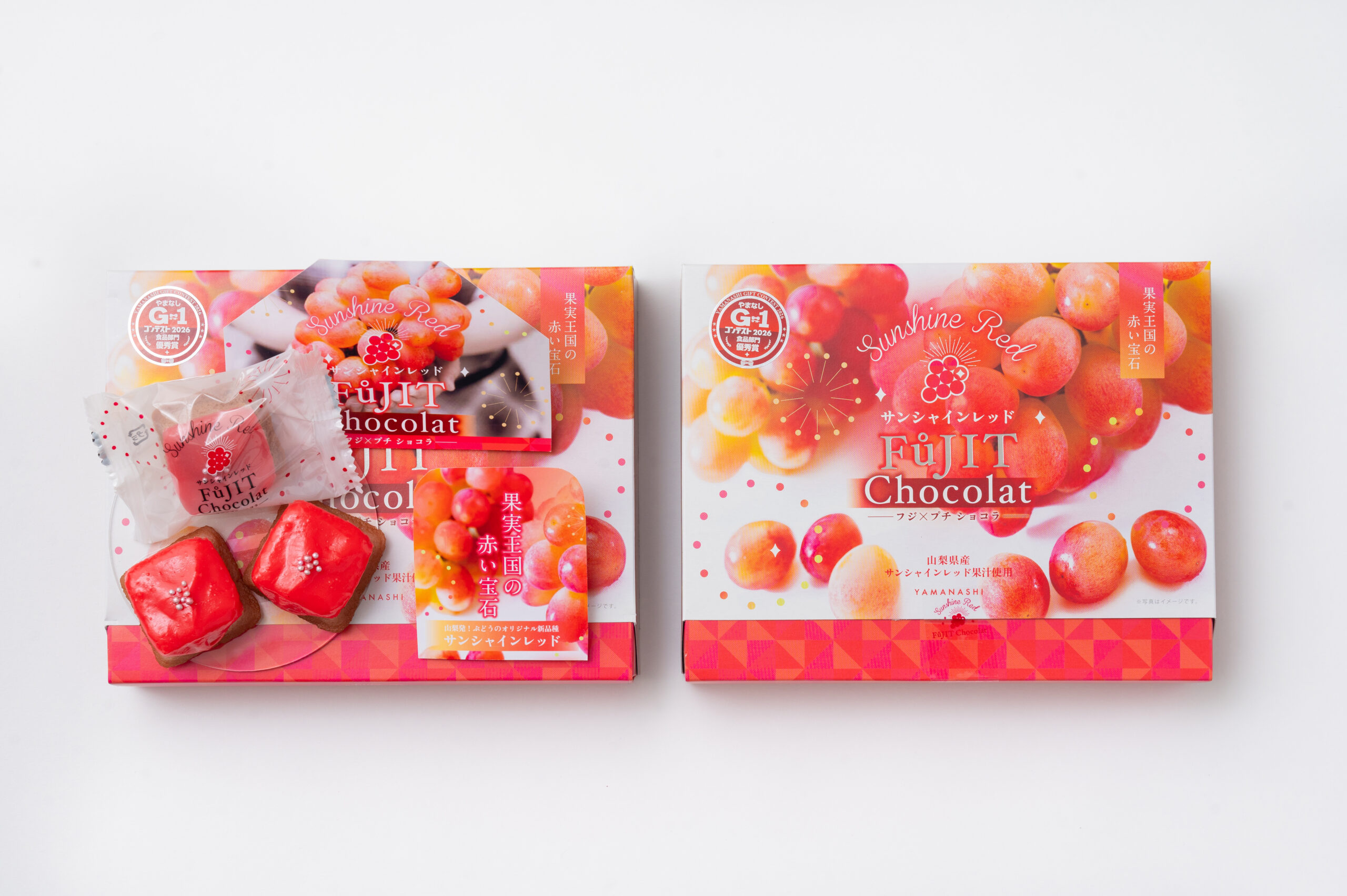 サンシャインレッド果汁を練り込んだキューブ型のしっとりケーキに、鮮やかなサンシャインレッド色のチョコをかけ、見た目は富士山をモチーフにデザイン。その上にトッピングしたアラザンは「赤い宝石」と称されるサンシャインレッドの煌めきをイメージし、ぶどうの果粉(ブルーム)や富士の雪をも表現しています。また一口食べると広がる華やかな香りを地元の調香師「INNER FLARE」に監修。つまり「サンシャインレッドFùJITショコラ」は、山梨のシンボル「富士山」と、次代を担う「サンシャインレッド」を小さなスイーツに込めた、新しいギフトのかたちなのです。